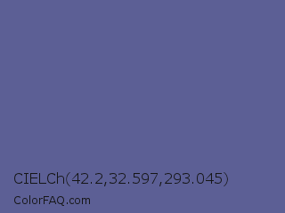 CIELCh 42.2,32.597,293.045 Color is a normal blue color and the nearest color is UCLA Blue #536895. Hex code #5c5f95 and RGB value is rgb(92,95,149). In RGB color space, this color is composed of 36% red, 37% green, 58% blue, In CMYK color space, this color is composed of 38% cyan, 36% magenta, 0% yellow , 42% black , In HSL color space, this color has a hue angle of 237° , 24% saturation and 47% lightness.