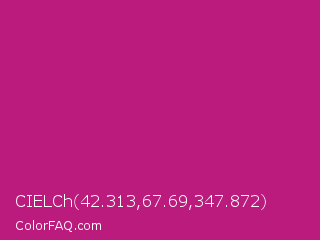 CIELCh 42.313,67.69,347.872 Color is a normal magenta color and the nearest color is Red Violet #c71585. Hex code #ba1b7d and RGB value is rgb(186,27,125). In RGB color space, this color is composed of 73% red, 11% green, 49% blue, In CMYK color space, this color is composed of 0% cyan, 85% magenta, 33% yellow , 27% black , In HSL color space, this color has a hue angle of 323° , 75% saturation and 42% lightness.
