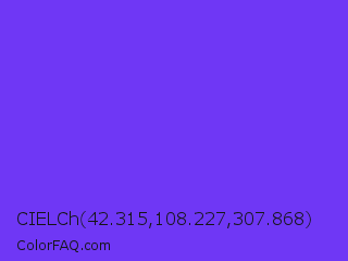 CIELCh 42.315,108.227,307.868 Color is a normal indigo color and the nearest color is Blue Violet #8a2be2. Hex code #6f37f5 and RGB value is rgb(111,55,245). In RGB color space, this color is composed of 44% red, 22% green, 96% blue, In CMYK color space, this color is composed of 55% cyan, 78% magenta, 0% yellow , 4% black , In HSL color space, this color has a hue angle of 258° , 90% saturation and 59% lightness.