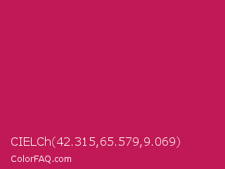 CIELCh 42.315,65.579,9.069 Color is a normal rose color and the nearest color is Rose Red #c21e56. Hex code #c11956 and RGB value is rgb(193,25,86). In RGB color space, this color is composed of 76% red, 10% green, 34% blue, In CMYK color space, this color is composed of 0% cyan, 87% magenta, 55% yellow , 24% black , In HSL color space, this color has a hue angle of 338° , 77% saturation and 43% lightness.