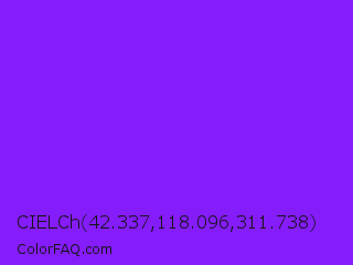 CIELCh 42.337,118.096,311.738 Color is a normal violet color and the nearest color is Blue Violet #8a2be2. Hex code #851cfa and RGB value is rgb(133,28,250). In RGB color space, this color is composed of 52% red, 11% green, 98% blue, In CMYK color space, this color is composed of 47% cyan, 89% magenta, 0% yellow , 2% black , In HSL color space, this color has a hue angle of 268° , 96% saturation and 55% lightness.