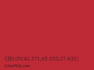 CIELCh 42.371,65.033,27.632 Color is a normal red color and the nearest color is Well Read #b43332. Hex code #bd2a36 and RGB value is rgb(189,42,54). In RGB color space, this color is composed of 74% red, 16% green, 21% blue, In CMYK color space, this color is composed of 0% cyan, 78% magenta, 71% yellow , 26% black , In HSL color space, this color has a hue angle of 355° , 64% saturation and 45% lightness.