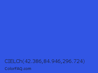 CIELCh 42.386,84.946,296.724 Color is a normal blue color and the nearest color is Royal Blue #4169e1. Hex code #3155e4 and RGB value is rgb(49,85,228). In RGB color space, this color is composed of 19% red, 33% green, 89% blue, In CMYK color space, this color is composed of 79% cyan, 63% magenta, 0% yellow , 11% black , In HSL color space, this color has a hue angle of 228° , 77% saturation and 54% lightness.