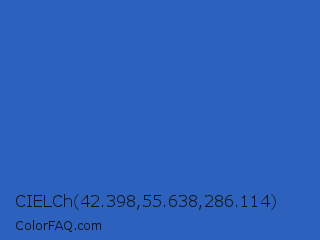 CIELCh 42.398,55.638,286.114 Color is a normal blue color and the nearest color is Cerulean Blue #2a52be. Hex code #2c61bd and RGB value is rgb(44,97,189). In RGB color space, this color is composed of 17% red, 38% green, 74% blue, In CMYK color space, this color is composed of 77% cyan, 49% magenta, 0% yellow , 26% black , In HSL color space, this color has a hue angle of 218° , 62% saturation and 46% lightness.