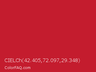 CIELCh 42.405,72.097,29.348 Color is a normal red color and the nearest color is Fire Engine Red #ce2029. Hex code #c41c2e and RGB value is rgb(196,28,46). In RGB color space, this color is composed of 77% red, 11% green, 18% blue, In CMYK color space, this color is composed of 0% cyan, 86% magenta, 77% yellow , 23% black , In HSL color space, this color has a hue angle of 354° , 75% saturation and 44% lightness.