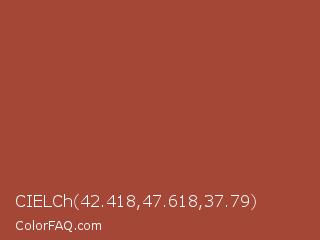 CIELCh 42.418,47.618,37.79 Color is a normal red color and the nearest color is Medium Carmine #af4035. Hex code #a54736 and RGB value is rgb(165,71,54). In RGB color space, this color is composed of 65% red, 28% green, 21% blue, In CMYK color space, this color is composed of 0% cyan, 57% magenta, 67% yellow , 35% black , In HSL color space, this color has a hue angle of 9° , 51% saturation and 43% lightness.