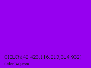 CIELCh 42.423,116.213,314.932 Color is a normal purple color and the nearest color is Electric Violet #8f00ff. Hex code #9600f0 and RGB value is rgb(150,0,240). In RGB color space, this color is composed of 59% red, 0% green, 94% blue, In CMYK color space, this color is composed of 38% cyan, 100% magenta, 0% yellow , 6% black , In HSL color space, this color has a hue angle of 278° , 100% saturation and 47% lightness.