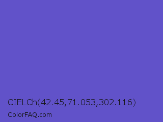 CIELCh 42.45,71.053,302.116 Color is a normal indigo color and the nearest color is Iris #5a4fcf. Hex code #6152c9 and RGB value is rgb(97,82,201). In RGB color space, this color is composed of 38% red, 32% green, 79% blue, In CMYK color space, this color is composed of 52% cyan, 59% magenta, 0% yellow , 21% black , In HSL color space, this color has a hue angle of 248° , 52% saturation and 55% lightness.