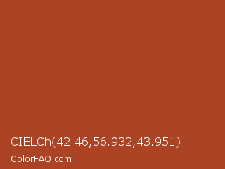 CIELCh 42.46,56.932,43.951 Color is a normal red color and the nearest color is Chinese Red #aa381e. Hex code #ab4324 and RGB value is rgb(171,67,36). In RGB color space, this color is composed of 67% red, 26% green, 14% blue, In CMYK color space, this color is composed of 0% cyan, 61% magenta, 79% yellow , 33% black , In HSL color space, this color has a hue angle of 14° , 65% saturation and 41% lightness.