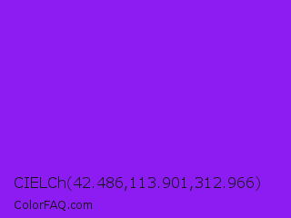CIELCh 42.486,113.901,312.966 Color is a normal purple color and the nearest color is Veronica #a020f0. Hex code #8c1cf2 and RGB value is rgb(140,28,242). In RGB color space, this color is composed of 55% red, 11% green, 95% blue, In CMYK color space, this color is composed of 42% cyan, 88% magenta, 0% yellow , 5% black , In HSL color space, this color has a hue angle of 271° , 89% saturation and 53% lightness.