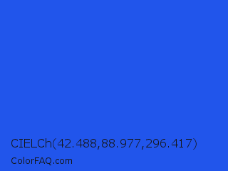 CIELCh 42.488,88.977,296.417 Color is a normal blue color and the nearest color is Palatinate Blue #273be2. Hex code #2155eb and RGB value is rgb(33,85,235). In RGB color space, this color is composed of 13% red, 33% green, 92% blue, In CMYK color space, this color is composed of 86% cyan, 64% magenta, 0% yellow , 8% black , In HSL color space, this color has a hue angle of 225° , 83% saturation and 53% lightness.