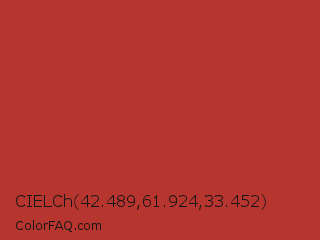 CIELCh 42.489,61.924,33.452 Color is a normal red color and the nearest color is Well Read #b43332. Hex code #b7352f and RGB value is rgb(183,53,47). In RGB color space, this color is composed of 72% red, 21% green, 18% blue, In CMYK color space, this color is composed of 0% cyan, 71% magenta, 74% yellow , 28% black , In HSL color space, this color has a hue angle of 3° , 59% saturation and 45% lightness.
