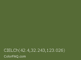 CIELCh 42.4,32.243,123.026 Color is a normal green color and the nearest color is Dark Olive Green #556b2f. Hex code #566b36 and RGB value is rgb(86,107,54). In RGB color space, this color is composed of 34% red, 42% green, 21% blue, In CMYK color space, this color is composed of 20% cyan, 0% magenta, 50% yellow , 58% black , In HSL color space, this color has a hue angle of 84° , 33% saturation and 32% lightness.