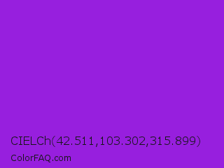 CIELCh 42.511,103.302,315.899 Color is a normal purple color and the nearest color is Blue Violet #8a2be2. Hex code #971fde and RGB value is rgb(151,31,222). In RGB color space, this color is composed of 59% red, 12% green, 87% blue, In CMYK color space, this color is composed of 32% cyan, 86% magenta, 0% yellow , 13% black , In HSL color space, this color has a hue angle of 278° , 75% saturation and 50% lightness.