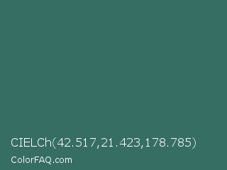 CIELCh 42.517,21.423,178.785 Color is a normal cyan color and the nearest color is William #3a686c. Hex code #366e63 and RGB value is rgb(54,110,99). In RGB color space, this color is composed of 21% red, 43% green, 39% blue, In CMYK color space, this color is composed of 51% cyan, 0% magenta, 10% yellow , 57% black , In HSL color space, this color has a hue angle of 168° , 34% saturation and 32% lightness.
