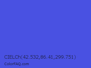 CIELCh 42.532,86.41,299.751 Color is a normal blue color and the nearest color is Majorelle Blue #6050dc. Hex code #4951e3 and RGB value is rgb(73,81,227). In RGB color space, this color is composed of 29% red, 32% green, 89% blue, In CMYK color space, this color is composed of 68% cyan, 64% magenta, 0% yellow , 11% black , In HSL color space, this color has a hue angle of 237° , 73% saturation and 59% lightness.
