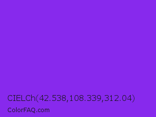 CIELCh 42.538,108.339,312.04 Color is a normal violet color and the nearest color is Blue Violet #8a2be2. Hex code #8729ed and RGB value is rgb(135,41,237). In RGB color space, this color is composed of 53% red, 16% green, 93% blue, In CMYK color space, this color is composed of 43% cyan, 83% magenta, 0% yellow , 7% black , In HSL color space, this color has a hue angle of 269° , 84% saturation and 55% lightness.