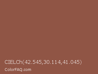 CIELCh 42.545,30.114,41.045 Color is a normal red color and the nearest color is Spicy Mix #885342. Hex code #905545 and RGB value is rgb(144,85,69). In RGB color space, this color is composed of 56% red, 33% green, 27% blue, In CMYK color space, this color is composed of 0% cyan, 41% magenta, 52% yellow , 44% black , In HSL color space, this color has a hue angle of 13° , 35% saturation and 42% lightness.