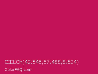 CIELCh 42.546,67.488,8.624 Color is a normal rose color and the nearest color is Pictorial Carmine #c30b4e. Hex code #c41257 and RGB value is rgb(196,18,87). In RGB color space, this color is composed of 77% red, 7% green, 34% blue, In CMYK color space, this color is composed of 0% cyan, 91% magenta, 56% yellow , 23% black , In HSL color space, this color has a hue angle of 337° , 83% saturation and 42% lightness.