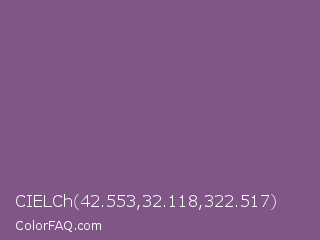 CIELCh 42.553,32.118,322.517 Color is a normal magenta color and the nearest color is Chinese Violet #856088. Hex code #7f5685 and RGB value is rgb(127,86,133). In RGB color space, this color is composed of 50% red, 34% green, 52% blue, In CMYK color space, this color is composed of 5% cyan, 35% magenta, 0% yellow , 48% black , In HSL color space, this color has a hue angle of 292° , 21% saturation and 43% lightness.