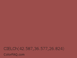 CIELCh 42.587,36.577,26.824 Color is a normal red color and the nearest color is Copper Rust #944747. Hex code #9c4d4b and RGB value is rgb(156,77,75). In RGB color space, this color is composed of 61% red, 30% green, 29% blue, In CMYK color space, this color is composed of 0% cyan, 51% magenta, 52% yellow , 39% black , In HSL color space, this color has a hue angle of 1° , 35% saturation and 45% lightness.