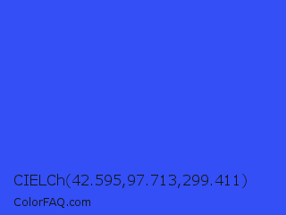 CIELCh 42.595,97.713,299.411 Color is a normal blue color and the nearest color is Ultramarine Blue #4166f5. Hex code #334ff5 and RGB value is rgb(51,79,245). In RGB color space, this color is composed of 20% red, 31% green, 96% blue, In CMYK color space, this color is composed of 79% cyan, 68% magenta, 0% yellow , 4% black , In HSL color space, this color has a hue angle of 231° , 91% saturation and 58% lightness.