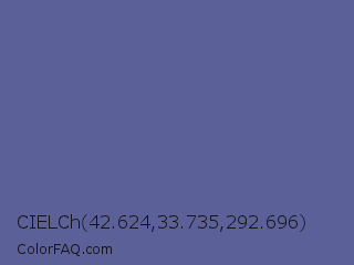 CIELCh 42.624,33.735,292.696 Color is a normal blue color and the nearest color is Dark Blue Gray #666699. Hex code #5c6098 and RGB value is rgb(92,96,152). In RGB color space, this color is composed of 36% red, 38% green, 60% blue, In CMYK color space, this color is composed of 39% cyan, 37% magenta, 0% yellow , 40% black , In HSL color space, this color has a hue angle of 236° , 25% saturation and 48% lightness.