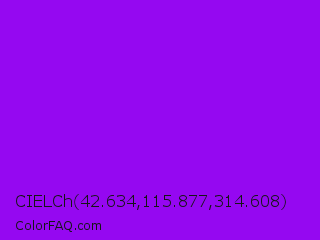 CIELCh 42.634,115.877,314.608 Color is a normal purple color and the nearest color is Electric Violet #8f00ff. Hex code #9508f1 and RGB value is rgb(149,8,241). In RGB color space, this color is composed of 58% red, 3% green, 95% blue, In CMYK color space, this color is composed of 38% cyan, 97% magenta, 0% yellow , 5% black , In HSL color space, this color has a hue angle of 276° , 94% saturation and 49% lightness.