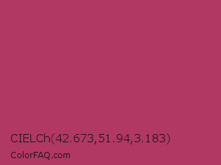 CIELCh 42.673,51.94,3.183 Color is a normal rose color and the nearest color is Rich Maroon #b03060. Hex code #b03862 and RGB value is rgb(176,56,98). In RGB color space, this color is composed of 69% red, 22% green, 38% blue, In CMYK color space, this color is composed of 0% cyan, 68% magenta, 44% yellow , 31% black , In HSL color space, this color has a hue angle of 339° , 52% saturation and 45% lightness.