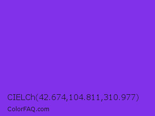 CIELCh 42.674,104.811,310.977 Color is a normal violet color and the nearest color is Blue Violet #8a2be2. Hex code #8231eb and RGB value is rgb(130,49,235). In RGB color space, this color is composed of 51% red, 19% green, 92% blue, In CMYK color space, this color is composed of 45% cyan, 79% magenta, 0% yellow , 8% black , In HSL color space, this color has a hue angle of 266° , 82% saturation and 56% lightness.