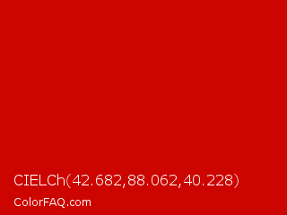 CIELCh 42.682,88.062,40.228 Color is a normal red color and the nearest color is Boston University Red #cc0000. Hex code #cc0500 and RGB value is rgb(204,5,0). In RGB color space, this color is composed of 80% red, 2% green, 0% blue, In CMYK color space, this color is composed of 0% cyan, 98% magenta, 100% yellow , 20% black , In HSL color space, this color has a hue angle of 1° , 100% saturation and 40% lightness.