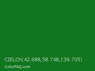 CIELCh 42.688,58.748,139.705 Color is a dark green color and the nearest color is La Salle Green #087830. Hex code #12751f and RGB value is rgb(18,117,31). In RGB color space, this color is composed of 7% red, 46% green, 12% blue, In CMYK color space, this color is composed of 85% cyan, 0% magenta, 74% yellow , 54% black , In HSL color space, this color has a hue angle of 128° , 73% saturation and 26% lightness.