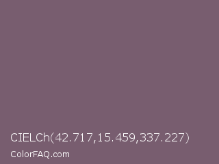 CIELCh 42.717,15.459,337.227 Color is a normal magenta color and the nearest color is Falcon #7f626d. Hex code #785d6f and RGB value is rgb(120,93,111). In RGB color space, this color is composed of 47% red, 36% green, 44% blue, In CMYK color space, this color is composed of 0% cyan, 23% magenta, 8% yellow , 53% black , In HSL color space, this color has a hue angle of 320° , 13% saturation and 42% lightness.