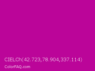 CIELCh 42.723,78.904,337.114 Color is a normal magenta color and the nearest color is Red Violet #c71585. Hex code #bb0599 and RGB value is rgb(187,5,153). In RGB color space, this color is composed of 73% red, 2% green, 60% blue, In CMYK color space, this color is composed of 0% cyan, 97% magenta, 18% yellow , 27% black , In HSL color space, this color has a hue angle of 311° , 95% saturation and 38% lightness.