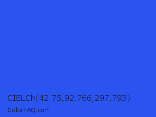 CIELCh 42.75,92.766,297.793 Color is a normal blue color and the nearest color is Palatinate Blue #273be2. Hex code #2b53f0 and RGB value is rgb(43,83,240). In RGB color space, this color is composed of 17% red, 33% green, 94% blue, In CMYK color space, this color is composed of 82% cyan, 65% magenta, 0% yellow , 6% black , In HSL color space, this color has a hue angle of 228° , 87% saturation and 55% lightness.