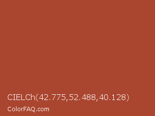 CIELCh 42.775,52.488,40.128 Color is a normal red color and the nearest color is Medium Carmine #af4035. Hex code #aa452f and RGB value is rgb(170,69,47). In RGB color space, this color is composed of 67% red, 27% green, 18% blue, In CMYK color space, this color is composed of 0% cyan, 59% magenta, 72% yellow , 33% black , In HSL color space, this color has a hue angle of 11° , 57% saturation and 43% lightness.