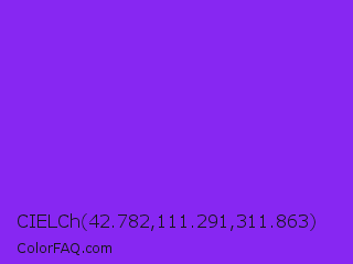 CIELCh 42.782,111.291,311.863 Color is a normal violet color and the nearest color is Blue Violet #8a2be2. Hex code #8727f2 and RGB value is rgb(135,39,242). In RGB color space, this color is composed of 53% red, 15% green, 95% blue, In CMYK color space, this color is composed of 44% cyan, 84% magenta, 0% yellow , 5% black , In HSL color space, this color has a hue angle of 268° , 89% saturation and 55% lightness.