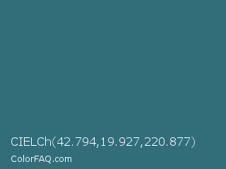 CIELCh 42.794,19.927,220.877 Color is a normal cyan color and the nearest color is Ming #36747d. Hex code #326d7a and RGB value is rgb(50,109,122). In RGB color space, this color is composed of 20% red, 43% green, 48% blue, In CMYK color space, this color is composed of 59% cyan, 11% magenta, 0% yellow , 52% black , In HSL color space, this color has a hue angle of 191° , 42% saturation and 34% lightness.