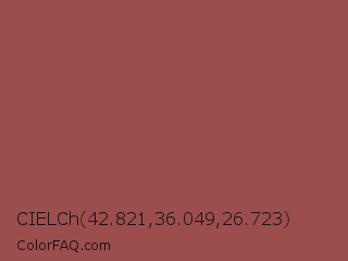 CIELCh 42.821,36.049,26.723 Color is a normal red color and the nearest color is Copper Rust #944747. Hex code #9c4e4c and RGB value is rgb(156,78,76). In RGB color space, this color is composed of 61% red, 31% green, 30% blue, In CMYK color space, this color is composed of 0% cyan, 50% magenta, 51% yellow , 39% black , In HSL color space, this color has a hue angle of 2° , 34% saturation and 45% lightness.
