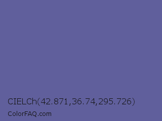 CIELCh 42.871,36.74,295.726 Color is a normal indigo color and the nearest color is Dark Blue Gray #666699. Hex code #605f9c and RGB value is rgb(96,95,156). In RGB color space, this color is composed of 38% red, 37% green, 61% blue, In CMYK color space, this color is composed of 38% cyan, 39% magenta, 0% yellow , 39% black , In HSL color space, this color has a hue angle of 241° , 24% saturation and 49% lightness.