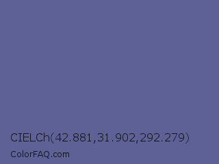 CIELCh 42.881,31.902,292.279 Color is a normal blue color and the nearest color is Dark Blue Gray #666699. Hex code #5d6196 and RGB value is rgb(93,97,150). In RGB color space, this color is composed of 36% red, 38% green, 59% blue, In CMYK color space, this color is composed of 38% cyan, 35% magenta, 0% yellow , 41% black , In HSL color space, this color has a hue angle of 236° , 23% saturation and 48% lightness.