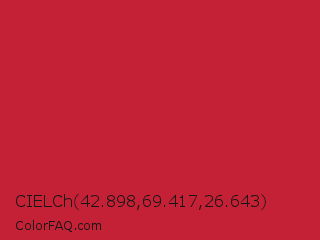 CIELCh 42.898,69.417,26.643 Color is a normal red color and the nearest color is Cardinal #c41e3a. Hex code #c42136 and RGB value is rgb(196,33,54). In RGB color space, this color is composed of 77% red, 13% green, 21% blue, In CMYK color space, this color is composed of 0% cyan, 83% magenta, 72% yellow , 23% black , In HSL color space, this color has a hue angle of 352° , 71% saturation and 45% lightness.