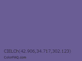 CIELCh 42.906,34.717,302.123 Color is a normal indigo color and the nearest color is Dark Blue Gray #666699. Hex code #6a5d96 and RGB value is rgb(106,93,150). In RGB color space, this color is composed of 42% red, 36% green, 59% blue, In CMYK color space, this color is composed of 29% cyan, 38% magenta, 0% yellow , 41% black , In HSL color space, this color has a hue angle of 254° , 23% saturation and 48% lightness.