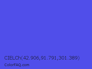 CIELCh 42.906,91.791,301.389 Color is a light indigo color and the nearest color is Majorelle Blue #6050dc. Hex code #504eea and RGB value is rgb(80,78,234). In RGB color space, this color is composed of 31% red, 31% green, 92% blue, In CMYK color space, this color is composed of 66% cyan, 67% magenta, 0% yellow , 8% black , In HSL color space, this color has a hue angle of 241° , 79% saturation and 61% lightness.
