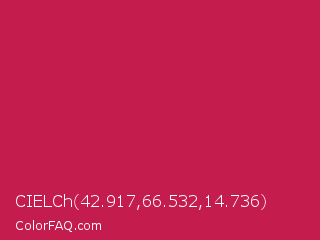 CIELCh 42.917,66.532,14.736 Color is a normal rose color and the nearest color is Maroon Flush #c32148. Hex code #c41c4d and RGB value is rgb(196,28,77). In RGB color space, this color is composed of 77% red, 11% green, 30% blue, In CMYK color space, this color is composed of 0% cyan, 86% magenta, 61% yellow , 23% black , In HSL color space, this color has a hue angle of 343° , 75% saturation and 44% lightness.