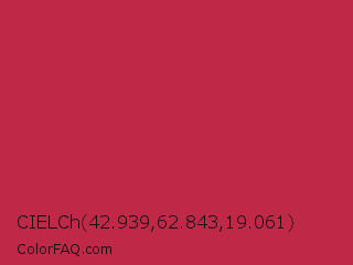 CIELCh 42.939,62.843,19.061 Color is a normal red color and the nearest color is French Raspberry #c72c48. Hex code #bf2947 and RGB value is rgb(191,41,71). In RGB color space, this color is composed of 75% red, 16% green, 28% blue, In CMYK color space, this color is composed of 0% cyan, 79% magenta, 63% yellow , 25% black , In HSL color space, this color has a hue angle of 348° , 65% saturation and 45% lightness.
