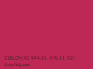 CIELCh 42.944,61.476,11.02 Color is a normal rose color and the nearest color is Rose Red #c21e56. Hex code #be2855 and RGB value is rgb(190,40,85). In RGB color space, this color is composed of 75% red, 16% green, 33% blue, In CMYK color space, this color is composed of 0% cyan, 79% magenta, 55% yellow , 25% black , In HSL color space, this color has a hue angle of 342° , 65% saturation and 45% lightness.
