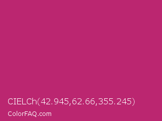 CIELCh 42.945,62.66,355.245 Color is a normal rose color and the nearest color is Hibiscus #b6316c. Hex code #bb2670 and RGB value is rgb(187,38,112). In RGB color space, this color is composed of 73% red, 15% green, 44% blue, In CMYK color space, this color is composed of 0% cyan, 80% magenta, 40% yellow , 27% black , In HSL color space, this color has a hue angle of 330° , 66% saturation and 44% lightness.