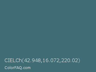 CIELCh 42.948,16.072,220.02 Color is a normal cyan color and the nearest color is Blue Bayoux #496679. Hex code #406c76 and RGB value is rgb(64,108,118). In RGB color space, this color is composed of 25% red, 42% green, 46% blue, In CMYK color space, this color is composed of 46% cyan, 8% magenta, 0% yellow , 54% black , In HSL color space, this color has a hue angle of 191° , 30% saturation and 36% lightness.