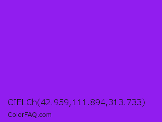 CIELCh 42.959,111.894,313.733 Color is a normal purple color and the nearest color is Veronica #a020f0. Hex code #911def and RGB value is rgb(145,29,239). In RGB color space, this color is composed of 57% red, 11% green, 94% blue, In CMYK color space, this color is composed of 39% cyan, 88% magenta, 0% yellow , 6% black , In HSL color space, this color has a hue angle of 273° , 87% saturation and 53% lightness.